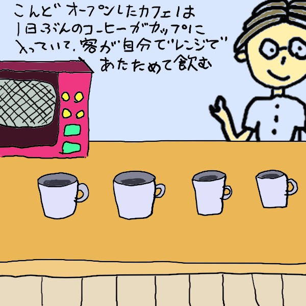 こんどオープンしたカフェは1日分のコーヒーがカップに入っていて客が自分で温めて飲む #お絵描き #drawing #イラスト #創作です