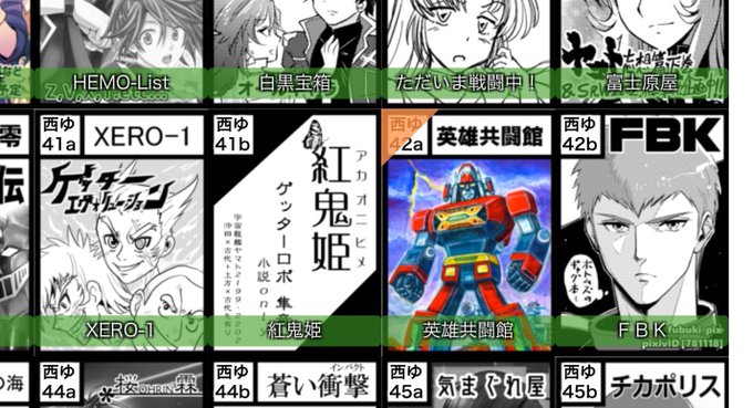 あなたのサークル「英雄共闘館」は、金曜日 東地区“ユ”ブロック-46a に配置されました。 マジンガーマガジン7頑張って描きます!来てください