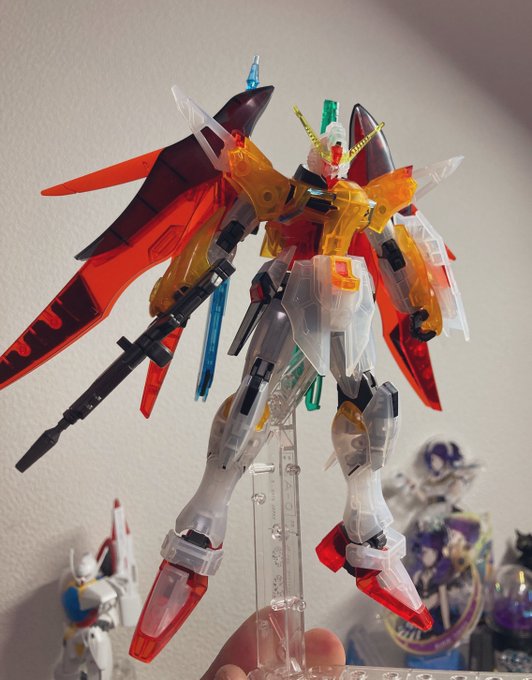 1 12 HGデスティニーガンダム(ハイネ専用機)クリアカラー完成っす。 クリアランナーAの色合いが「夏!」って感じで詰まってるので、夏場にもう1回組みたいなぁってところです。 #ガンプラ 22/01/18 22:42
