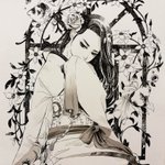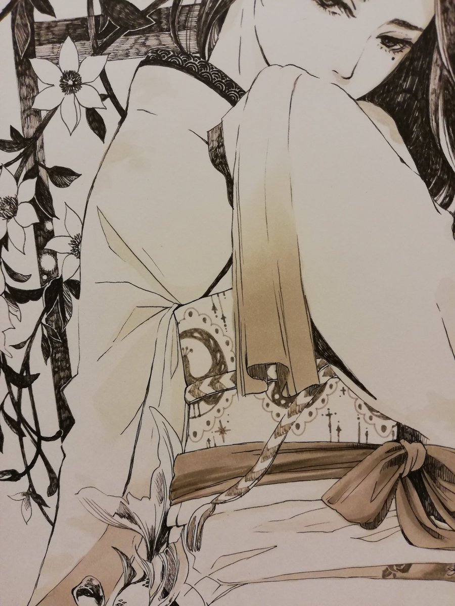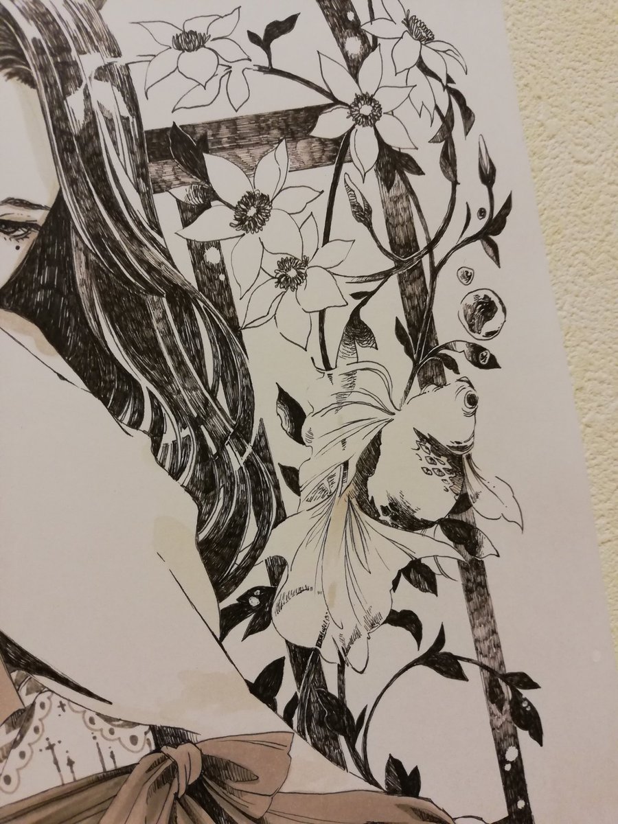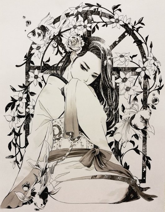 6 18 金魚とクレマチス 帯も可愛いのでぜひご覧ください♪ 気泡と鱗を描くのが楽しかったです!! #アナログイラスト #モノクロイラスト #着物 #ペン画 21/07/03 02:44