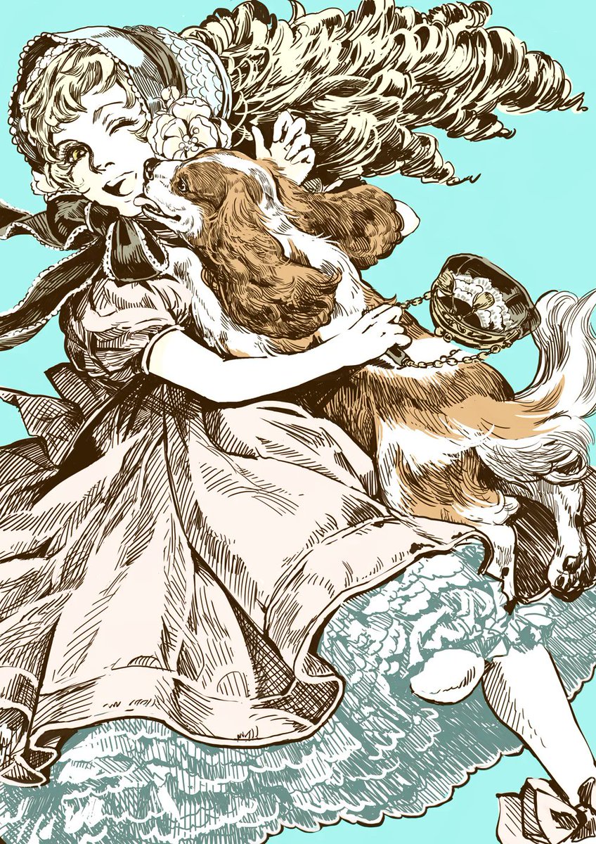 Dog Dress Hug Bow Flower Fur = Love ! ちょっと過去絵を漁っていたので投下。最近ツイッターではデフォルメキャラばかりあげておりますが、じつは、わりと細かいの描くのも好きな人なのでした。 #illustration
