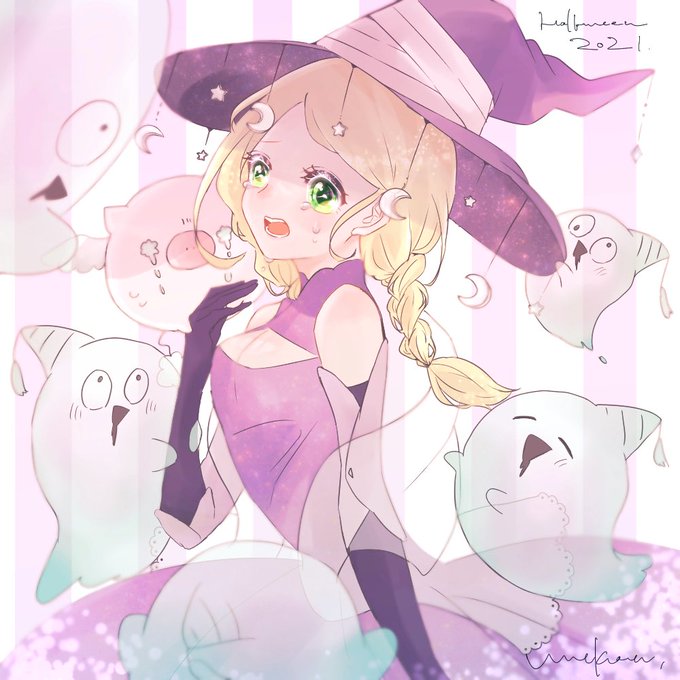 #ハロウィンイラスト展示会2021 #ハロウィンイラスト 昨日の夜まで何も描いてなかったけど ちゃんと間に合ったよ いえーい🙌 こわいおばけに囲まれちゃった魔女っ子セシリアちゃん(と、ステラちゃん)です ハッピーハロウィン〜🎃(´・🐽・`)プギ