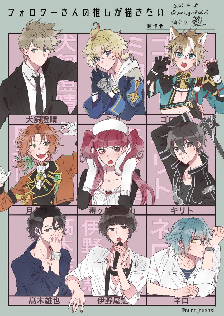 #フォロワーさんの推しが描きたい だいぶ時間かかってしまいましたが無事できました〜!😆 リクエストくださった方ありがとうございました💕 色んな子描けて楽しかった✨ 余った枠はいのちゃんとネロぽんにした✌️