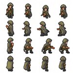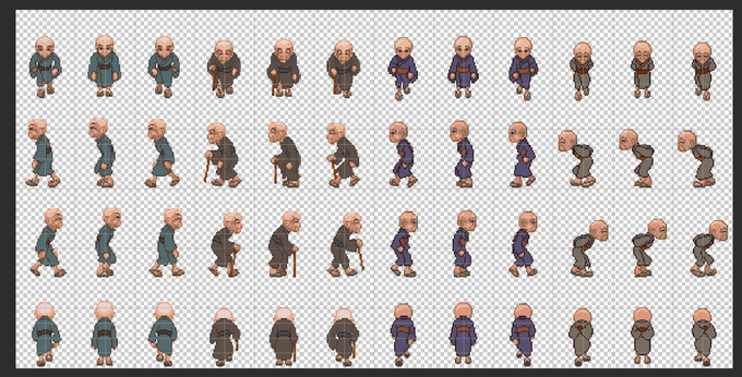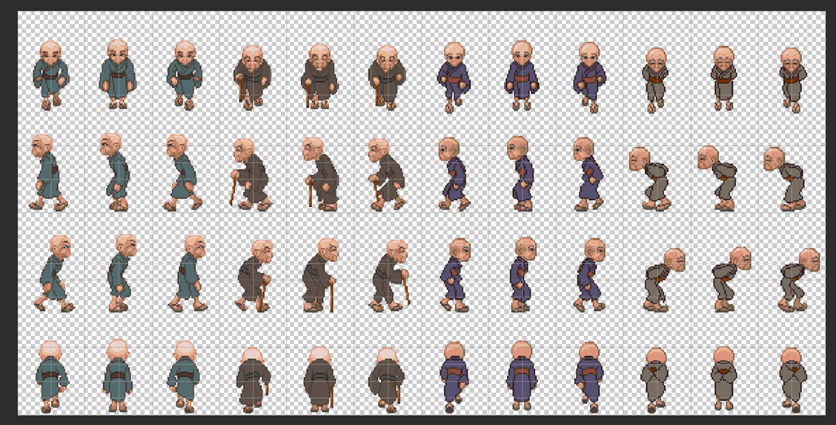 【ChronicleofGrimReapers】 あまり進捗報告をしていませんが、延々と歩行グラを増やしていたりします。 まだまだ作業途中だけど歩行グラは週明けまでには海ぶどうに渡したい……🙃 (鉱物の微塵粉) #ドット絵 #RPGツクールMZ