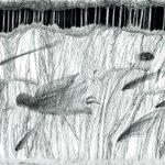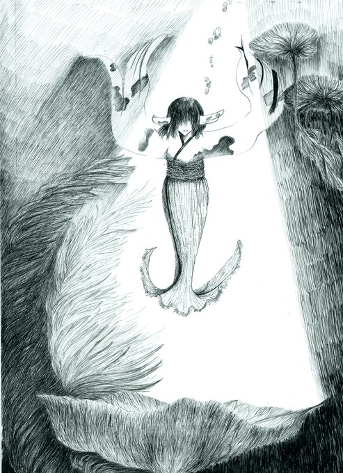 1 8 川に揺蕩う人の形をした金魚を描きました。 #ペン画 #モノクロイラスト #アナログイラスト 22/08/06 12:46