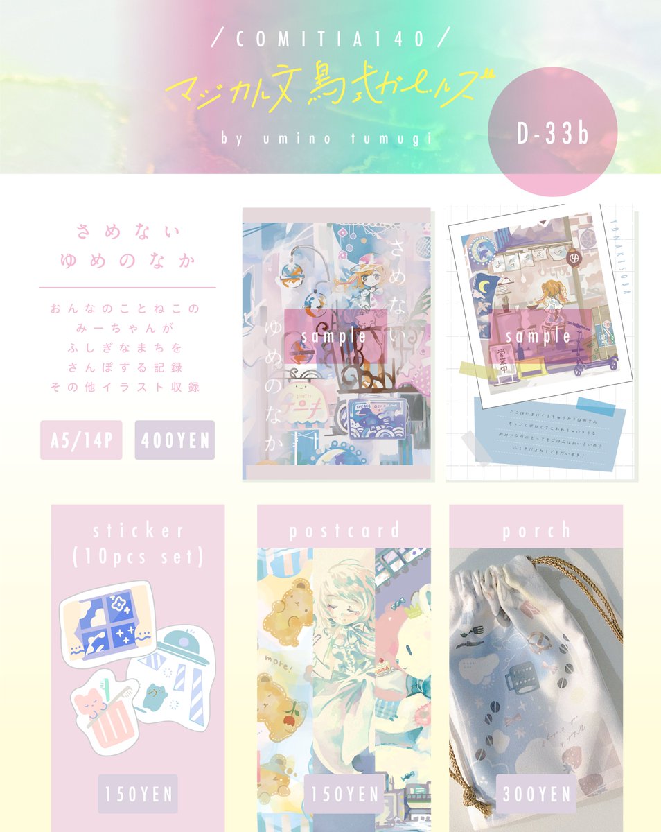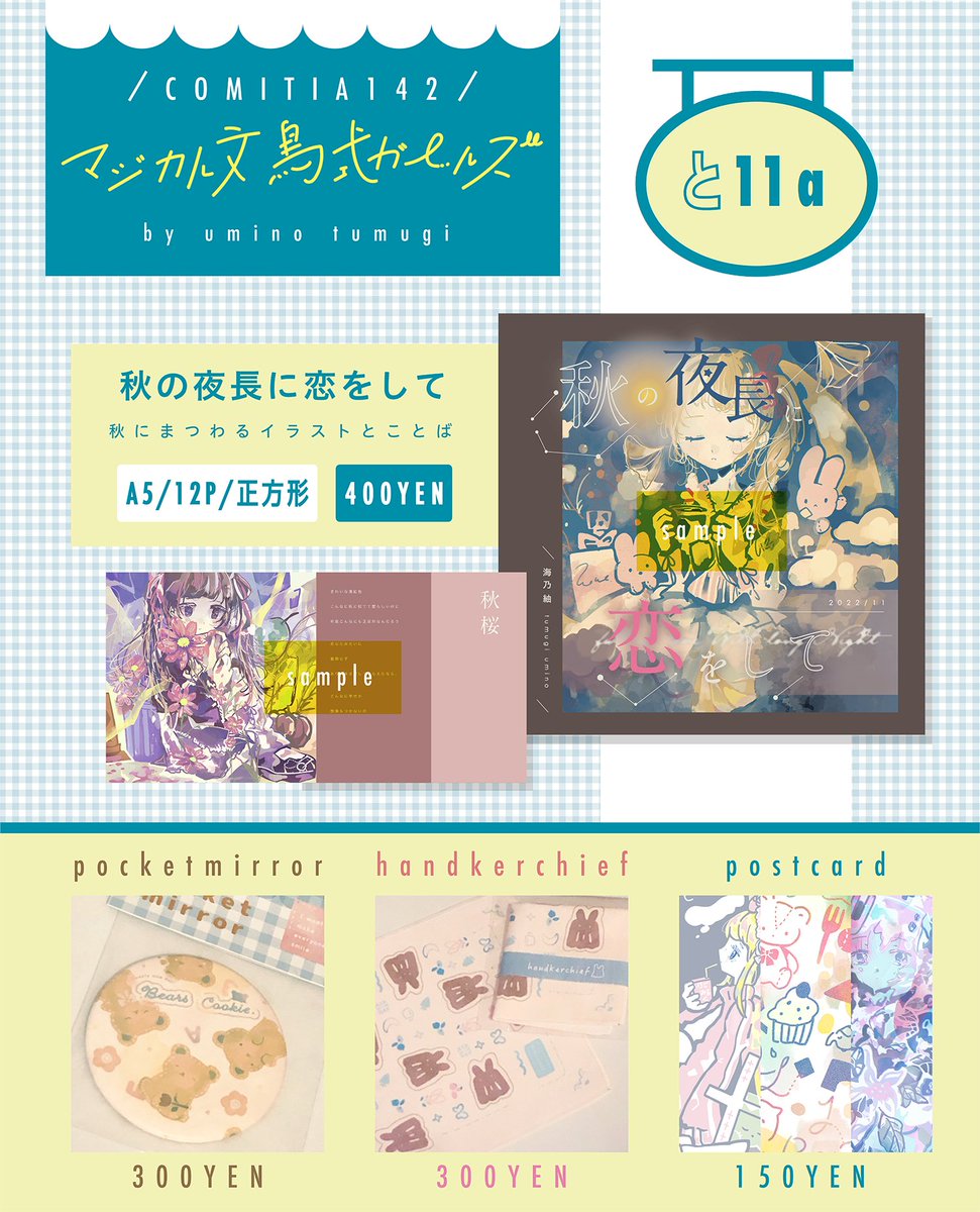 こんにちは!#COMITIA142 矢澤豆太郎くんと合同サークル「マジカル文鳥式ガールズ」うみのつむぎ頒布分のお品書きです🌕 スペース:と11a 新刊1種、雑貨はミラーとハンカチ、ポスカです! 今回はパッケージも可愛くしてみたので ぜひ時間合えばお立ち寄りください🍬 よろしくおねがいします🙇♀️💌