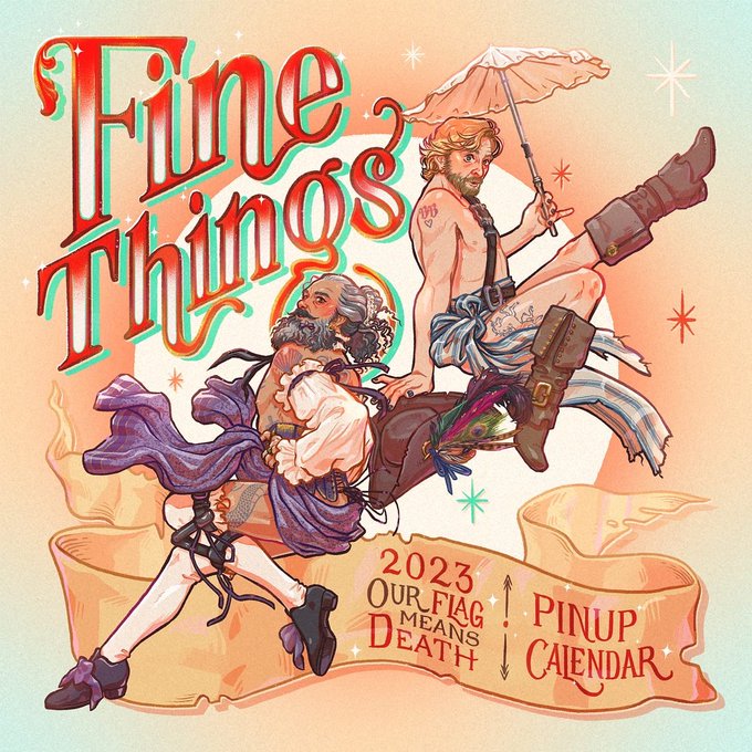 Here’s the cover of Fine Things, a saucy 2023 #OFMD pinup calendar- gorgeous lettering by @gingerhaole & characters+color by me! All proceeds will be donated to RainbowRailroad so don’t hesitate to add a lil spice to your 2023 ✨ 🏴☠️l*ink in bio🏴☠️ #OFMDfanart #OurFlagMeansDeath