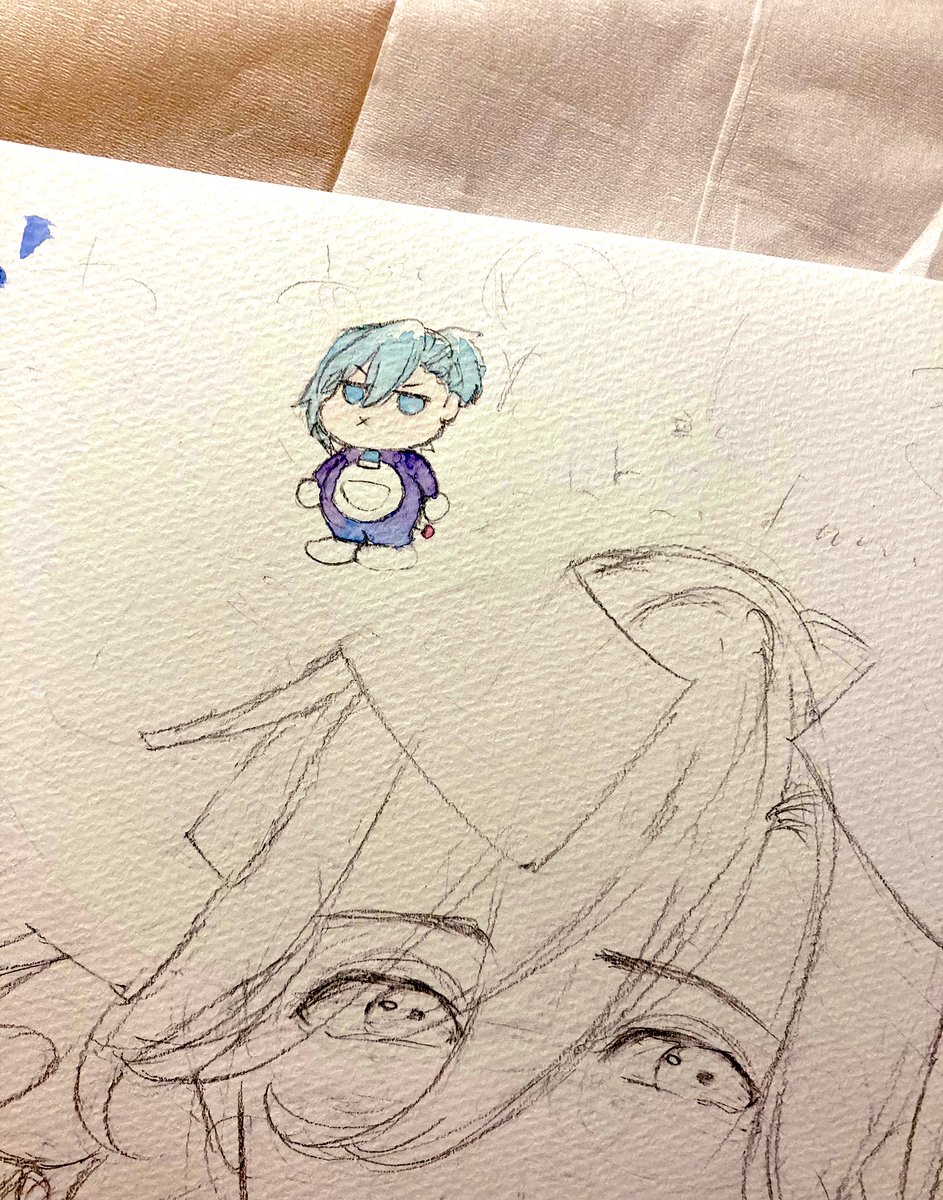 まってロキドラ新刊表紙どうしようかな〜ってラフやってたんだけど変なとこに藍エモンの落書きして詰んだvvvv