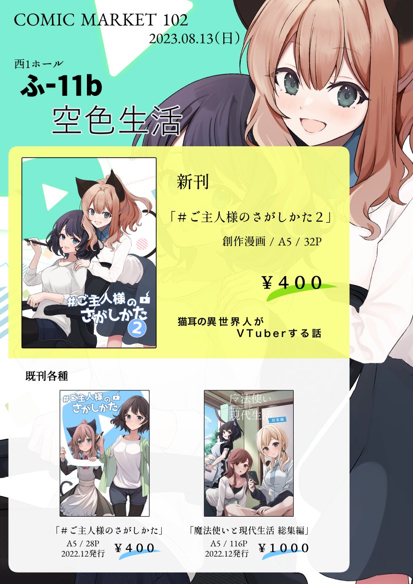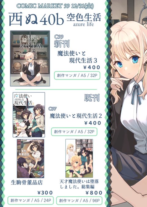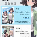 C99 空色生活のお品書きとなります。創作漫画の新刊の他、いくつか既刊も持っていきます。2日目(金)の西ぬ40bにてお待ちしております。 【書店委託はこちら】 🐯:ecs.toranoana.jp/tora/ec/item/0… 🍈:melonbooks.co.jp/detail/detail.…