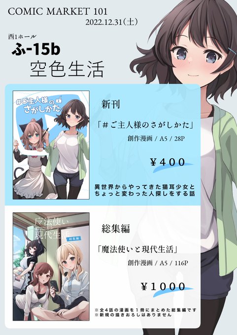 C101のお品書きです。2日目(土)西1-ふ15bにて創作漫画を頒布いたします。新刊は新規の漫画となり、他に過去作品4話を1冊にまとめた総集編を頒布予定です。 新刊の委託情報はこちら↓ メロン:melonbooks.co.jp/detail/detail.… とら :ecs.toranoana.jp/tora/ec/item/0…