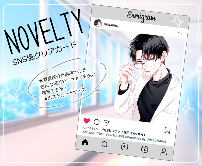 こちら5/4スパコミのノベルティ絵になります! 『リヴ⚫︎イ先生SNS風クリアカード』 背景が透明なので、リヴァイ先生を色んな場所で(こっそり)撮影してね イベントで新刊購入の方にお渡しします。 もらいに来てね〜〜🩶🤍