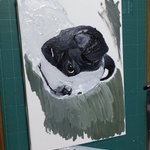 2 45 しっかりしたキャンバスに描いてみたく初挑戦。スマホケースとは違い塗りがまた難しい。少しでもあんこに近づけるよう頑張ってみよ!!! #ボストンテリア #イラスト #アクリル絵 #絵の具 #スマホケース 22/04/11 10:43