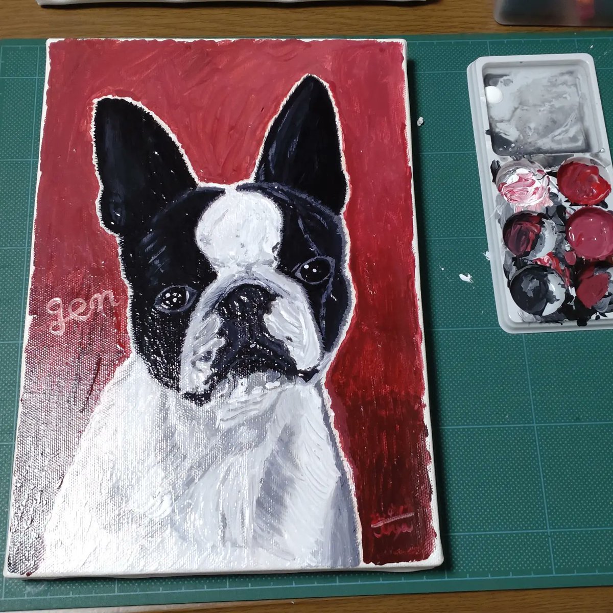 しっかりしたキャンバスに描いてみたく初挑戦。スマホケースとは違い塗りがまた難しい。少しでもあんこに近づけるよう頑張ってみよ!!! #ボストンテリア #イラスト #アクリル絵 #絵の具 #スマホケース