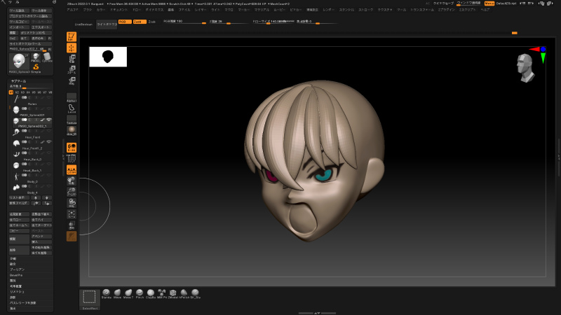 生首。 顔がある程度できたのでポリペイントで目を描いてみた。 口はもう少し奥行きをつけた方がいいかも。 そして前髪作り直し中。 前髪はこの状態で1パーツにして整えてみよう。 #zbrush