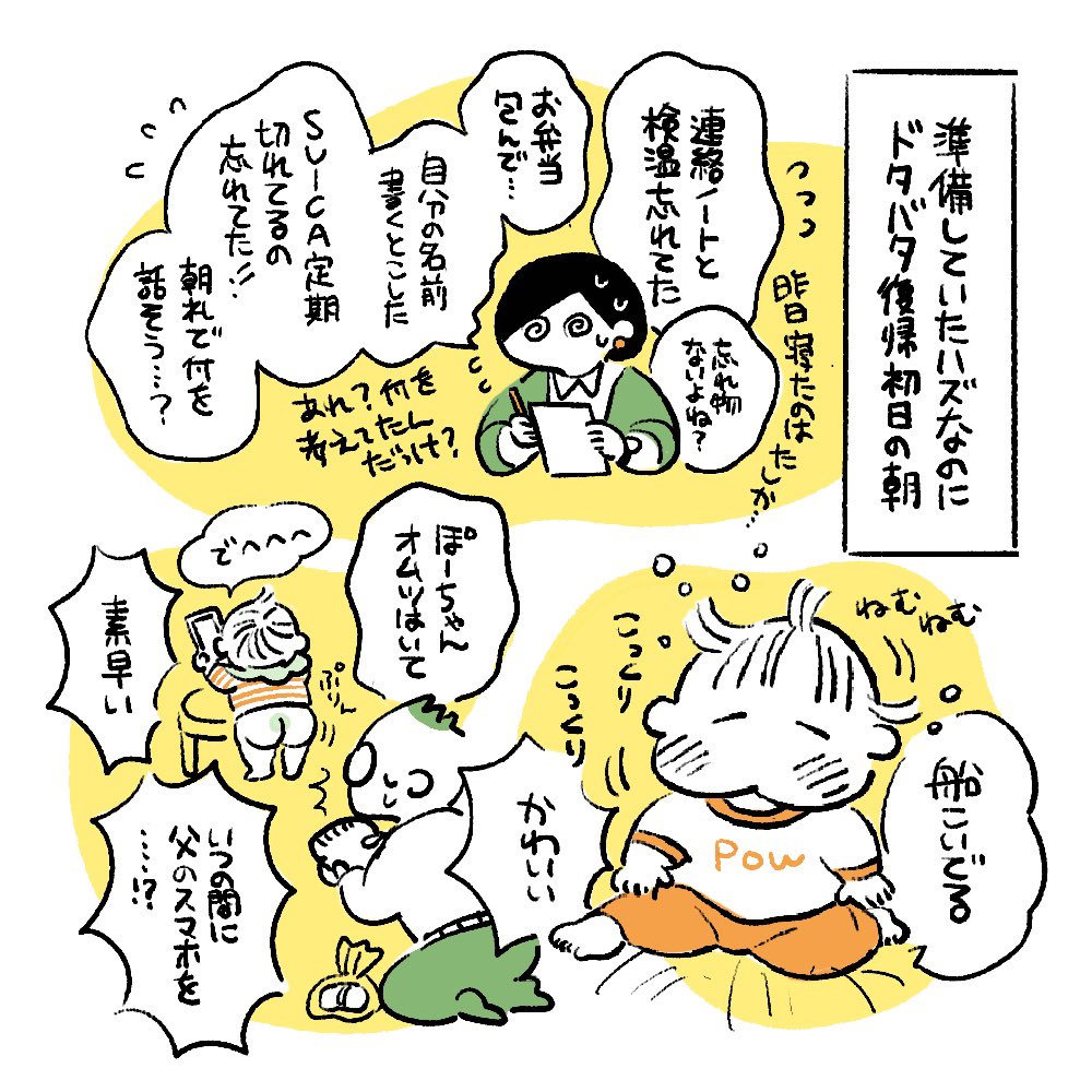 68 2612 復帰しました!育休終了後の脳みそがすっかり退化しています。ほとんど休んでる週もあり、こんな事で大丈夫?(有給残数)どうなっちゃうの〜?でもお迎え時のぽーちゃんは最高に可愛いです。カーチャン頑張る #育児漫画 #育児絵日記 22/05/29 12:04