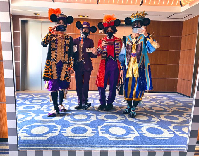 強めミッキー4人でイン@🌊 衣装は鹿工房🦌 ミスマス 🎭鹿 フォリーズ 🎩大路 ヴィラワ 😈新井 ミスティーク 🔱松尾 #Dハロ仮装2022