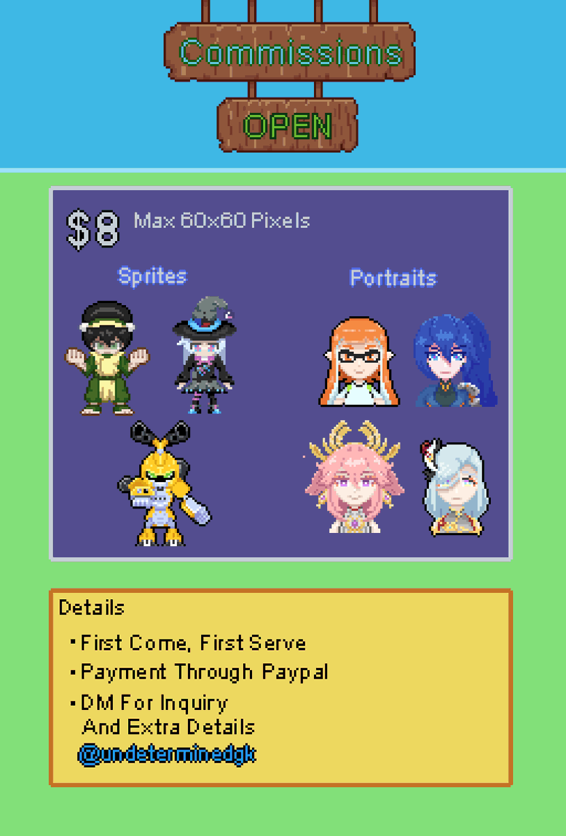 Commissions Open! -Simple Animations available (cost extra) -Check replies for examples of final product -Retweets are appreciated I'm also open to do other work outside the scope of these comms but no pricing has been set for those. #pixelart #commissionsopen #Commissions