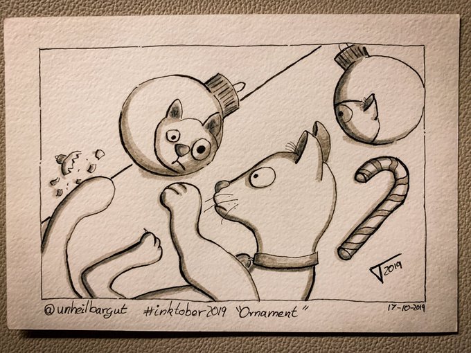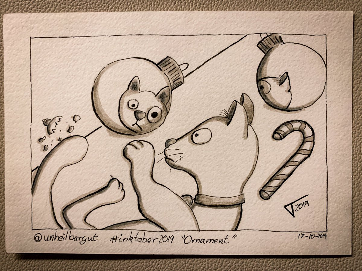 Es ist #Inktober2019 und das siebzehnte Stichwort war #Ornament. Minkie freute sich sehr über die Vorweihnachtszeit, wenn endlich wieder der Tannenbaum geschmückt wurde. #Tag17 #KleineKunstklasse