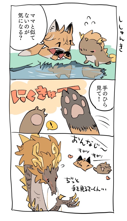 某湖水地方っぽい味付けの🐉🦊ファミリー(またもパパ不在) 乾燥してて清潔な穴ぐら暮らし