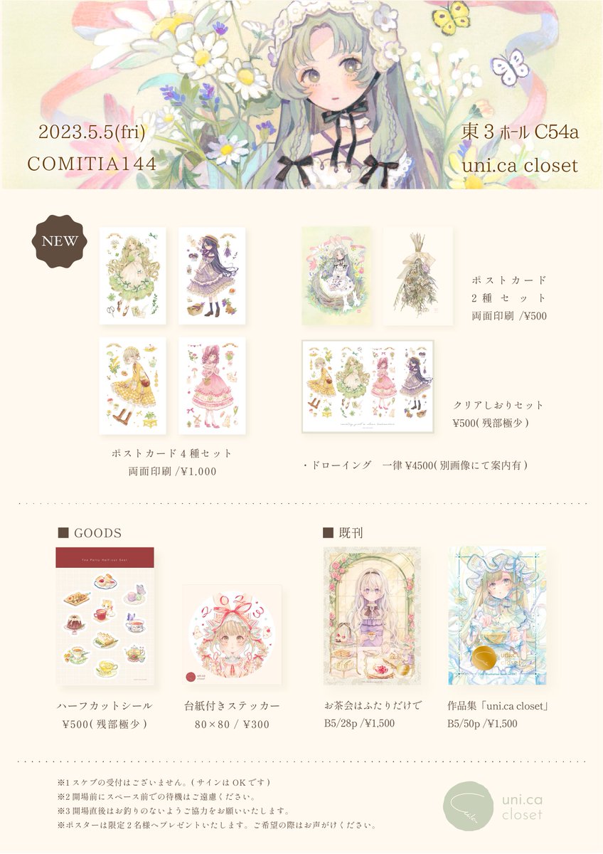 【COMITIA144お品書き】 5/5(金)COMITIA144のお品書きです! ドローイングの購入を検討中の方は2枚目の注意事項に目を通していただけると幸いです。【C54a】でお待ちしております。よろしくお願いいたします🌼 #コミティア144 #COMITIA144