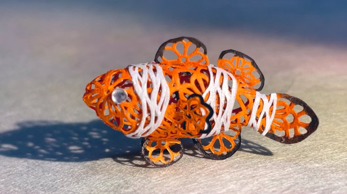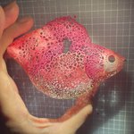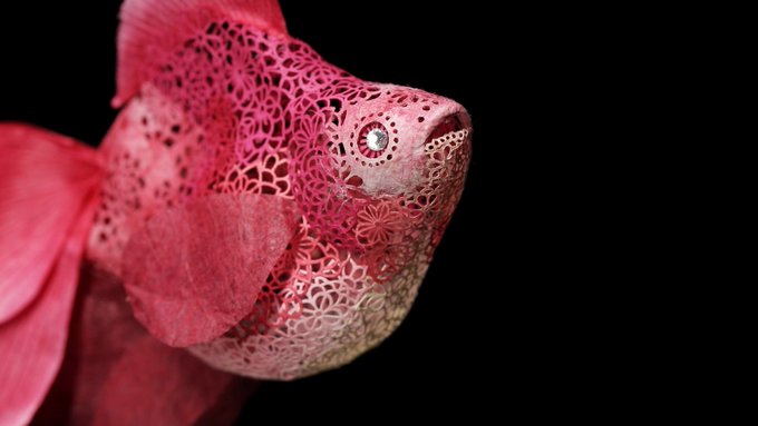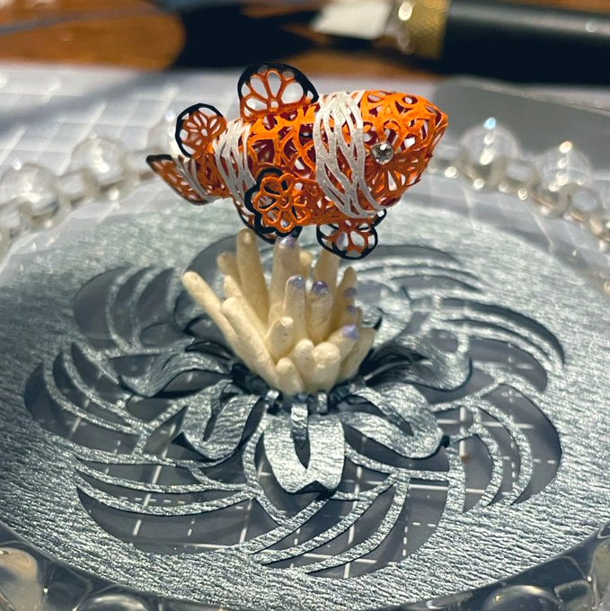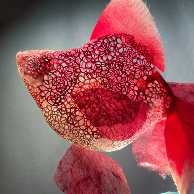 【金魚】 優美に燃えゆく赤い金魚です。 制作の様子をなるべくノーカットで公開した動画も投稿しております、ご覧ください☺️ youtube.com/channel/UCkbgc… #切り絵 #立体切り絵