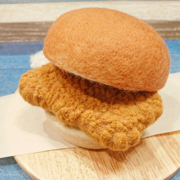 ファミチキバーガー完成🍔 リアルさとかわいさが両立してると思う(*´-`) #ファミチキバーガー #フェイクフード #羊毛フェルト