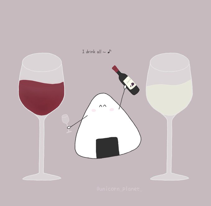 私は赤ワインの渋さをまだ受け入れられないお子様なのですが、おにぎりはどちらも飲めるみたいですね……?🍷🍾 #ゆるいイラスト #ユニプラ絵 #イラスト #イラスト好きな人と繋がりたい #illustration #夏の創作クラスタフォロー祭り #絵柄が好みって人にフォローされたい #ワインの日