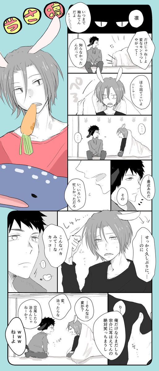 うさみみしっぽが生えてしまった山崎●介くんが人間に戻るために水泳部部長に交尾をもちかけるもそんなふざけたカッコでしたくないと一蹴され一人寂しく背を丸めて(自慰に励んで)いると見かねた部長がベッドに乗り込んできてよしよしセッ●スしてくれるお話みたい(よしよしどころかガン掘りされる