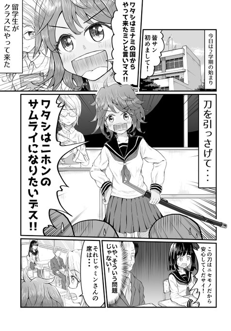 「ミンさんはサムライになりたい」(4P部門) 南の国からやってきた女の子がサムライになる方法を教えてもらう話です #うぇぶり新人賞 #漫画が読めるハッシュタグ