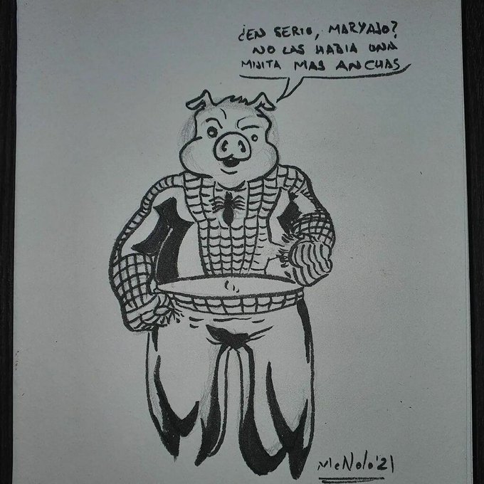 Dia 29. A petición de @maryajodelasestrellas , Cerdo se pone las mallas de Spiderman. Parece que necesita perder algo de peso. #inktoberspain #inktoberespaña #inktober #inktober2021 #ink #tinta #micronpigma #cerdoholmes #inktoberiscoming #blackandwh… instagr.am/p/CVmovAKKknW/