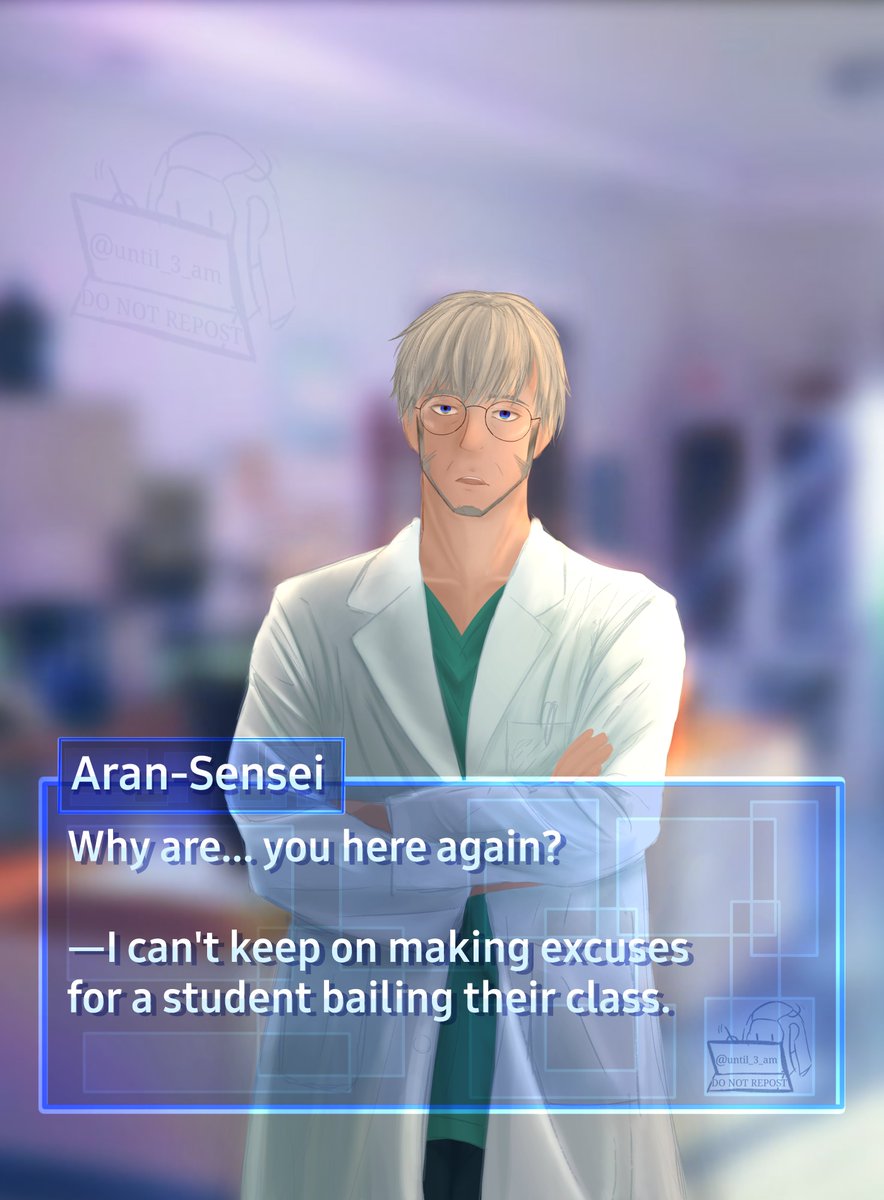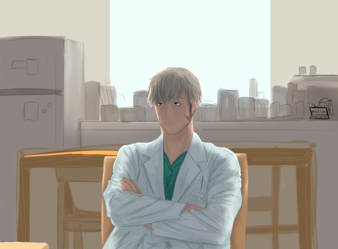 Consider,,, jaded school nurse Arupapa, we need that one tired Papa (As for his name uh, maybe one is considered close enough and he allows his given name...? M a y b e) -No text box ver. is in the replies- #アランの画廊