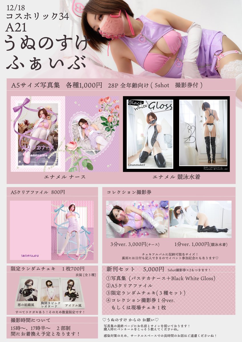 【#コスホリ お品書き】 今回は新作の写真集を2作品頒布いたします! ✨パステカナース ✨Black White Gloss ランダムチェキは数量限定となります! 当日は『A21』で皆様のお越しをお待ちしております😌💜 ⬇お得なセットの 当日取置き予約 はこちらから! triokini.com/circle/item/li…