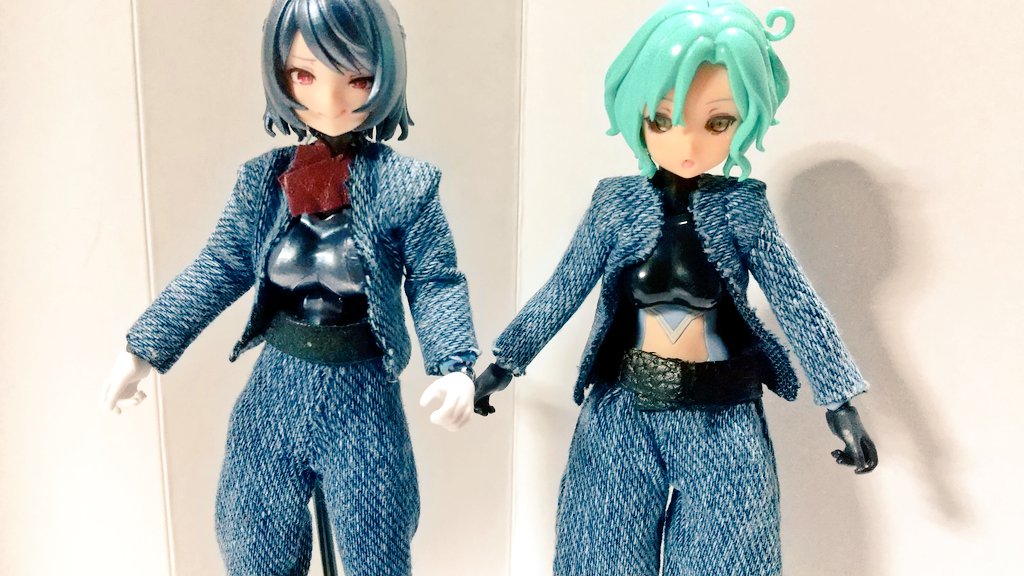 #メガミデバイス 何かトレンド入りしてはるらしいから便乗 タイトな布服を頑張って作るんだ( ´-ω-) 2枚目右のろーちゃんの袖とか手前味噌だがなかなかなんやで パンツはどうしても足曲げてると腰パンになる(´;ω;`)ブワッ かといって着席状態から逆算するとクソみたいなローライズになるんや……