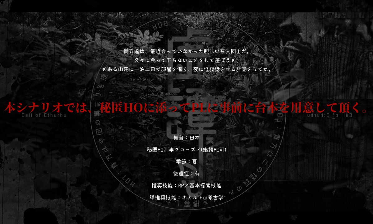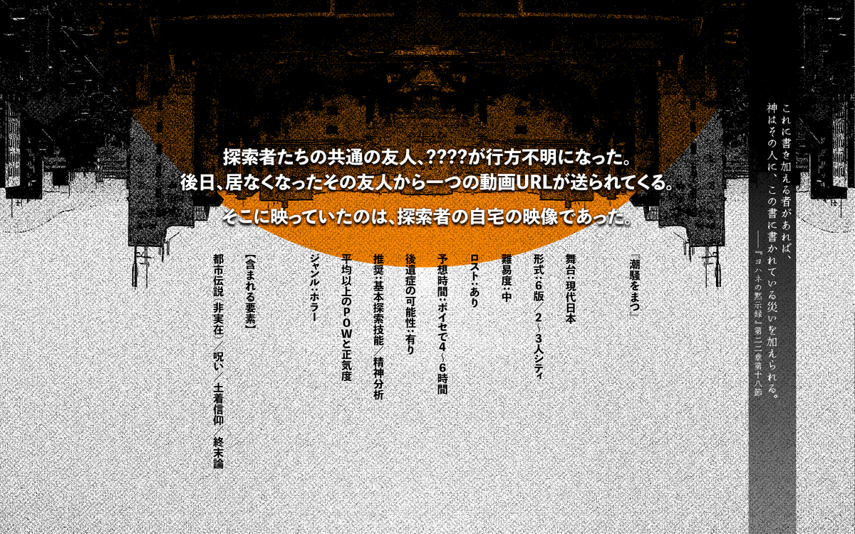 CoC『潮騒をまつ』 ある日、行方不明の友人から一つの動画URLが送られてくる。そこに映っていたのは、探索者の自宅の映像であった。 ──これに書き加える者があれば、神はその人に、この書に書かれている災いを加えられる。 ヨハネの黙示録 第22章第18節 suien.booth.pm/items/4272563
