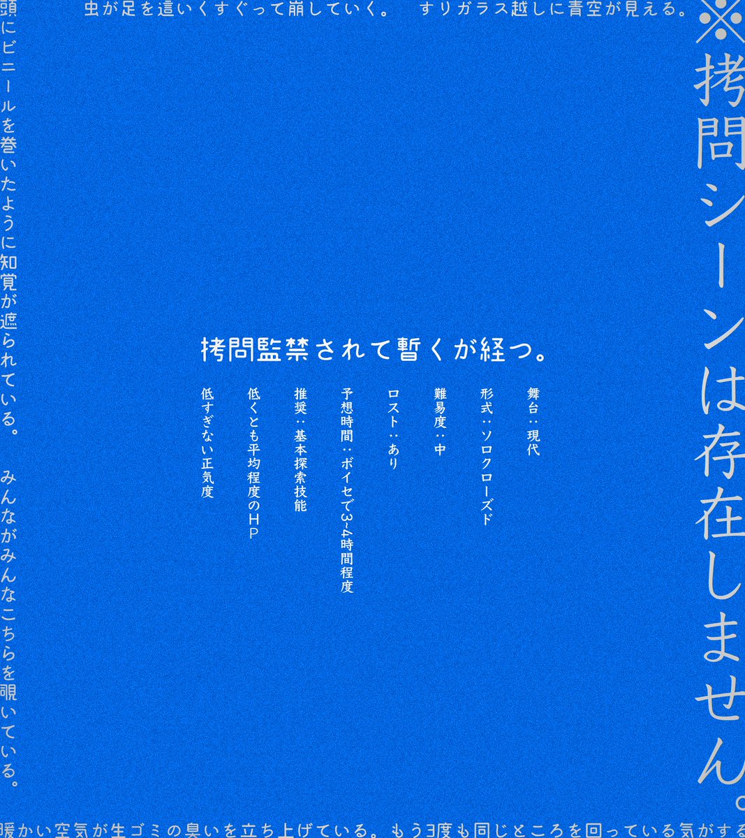 COCシナリオ 『瞠瞠巡るは魯鈍の廊(どうどうめぐるはろどんのろう)』 公開しました。 拷問監禁"済"の衰弱した探索者がカルト施設から脱出するシナリオです。 探索者は正気ではありません。任意の不定を二つ選んで下さい。 suien.booth.pm/items/2993328 #ポットラックパーティー企画
