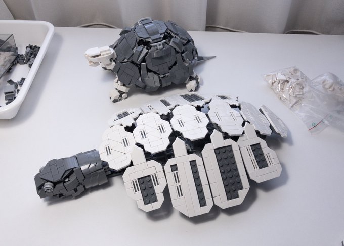 139 689 レゴブロックでメカ「ウミガメ」を作ったよ。 結構な大型サイズで枕くらいはあります。 口と首と四肢が柔軟に可動します。 首の可動時に、付け根のホースパーツは甲羅に収納されて関節などが隠れる仕組みになってます。 別アングルの写真等、↓に続きます。 #レゴ #LEGO 23/01/21 21:28