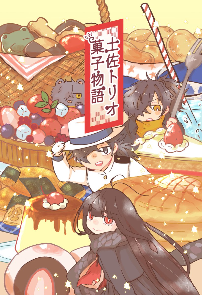 ハンサポ参加リストに掲載していただいたので改めて新刊サンプル上げさせていただきます🥞🍰🍮🍡 12/12のイベント合わせで、とらのあなにて通販委託します! 「土佐トリオ菓子物語」で、タイトル通りの内容となっております。 いつもの3人が甘いものを食べる本です。 #ハンサポ帝都騎殺級_準備中