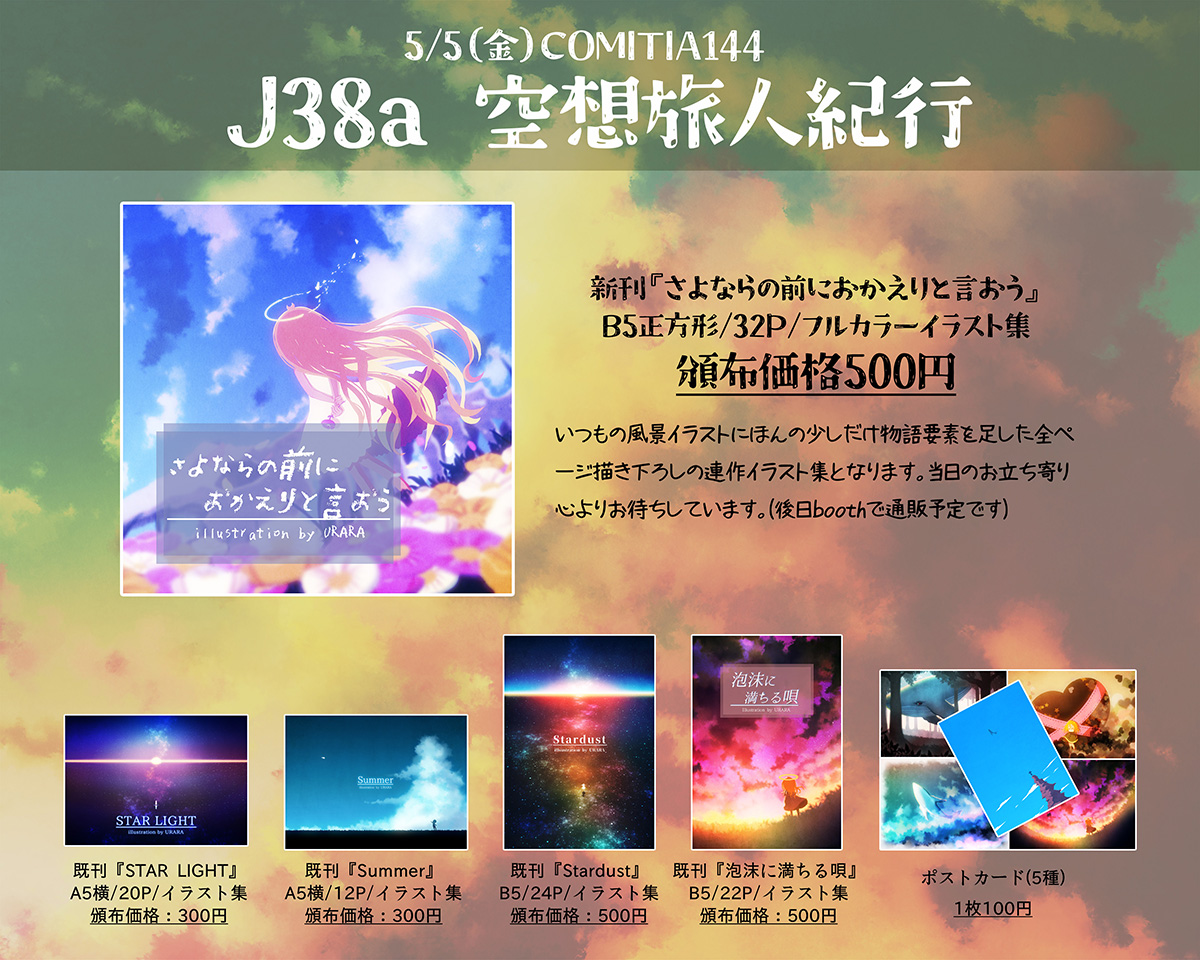 5/5(金)開催COMITIA144のお品書きでーす 新刊はいつもと少しだけ趣向を変えて正方形の変形製本、全ページ描き下ろしです。ほんの少しだけ物語要素もあります(本当にちょびっとだけど) 既刊とポストカードも少しだけ持ってくつもりです 当日は東2ホール "J38a" 空想旅人紀行でお待ちしております!