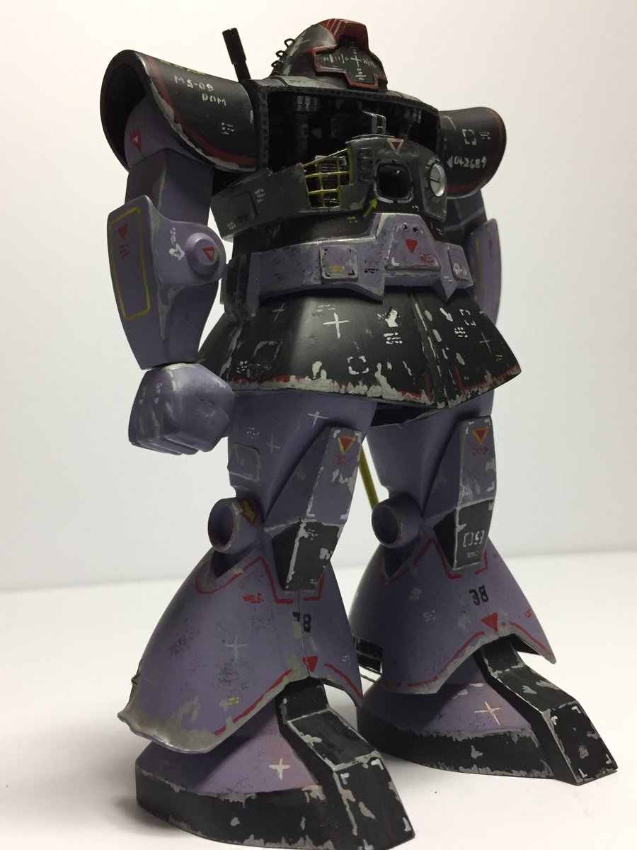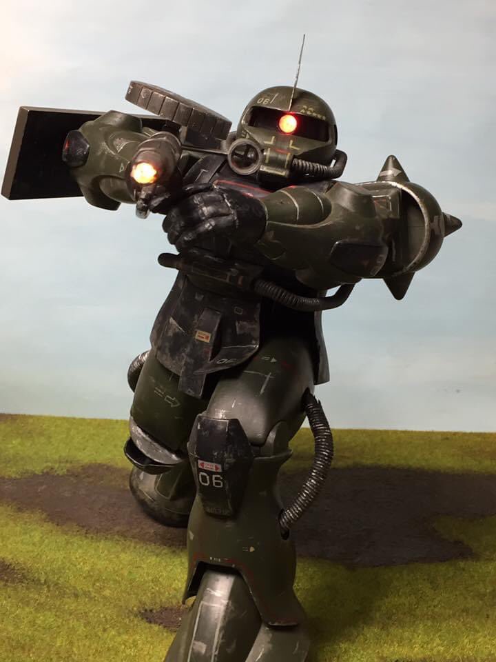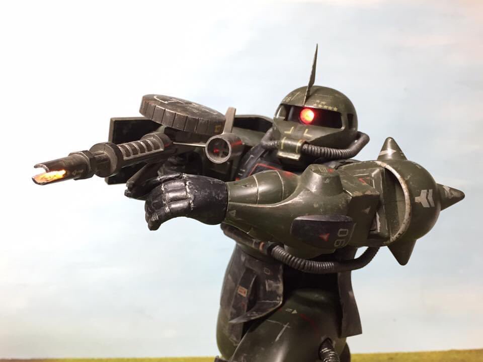 #これを見た人はジオン系MSをTLに放流しよう メカニックザク 5年ほど前の再販時に製作。シャアザクをまた、高校生の頃のように緑に塗ってしまう(笑) タミヤアクリル筆塗り、マーキング手描き、もちろん電飾は麦球。盾の骸骨はネットからデザイン拝借。股関節はハの字になるよう改造。