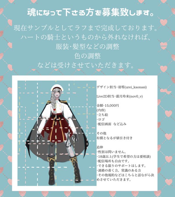 玲来さん@Ann_Kaguraduki と共同制作致します。 ❤️ハートの騎士❤️です。 色や髪型、服装も変更できます。 ラフまでしか制作していませんが、 🂱立ち絵 🂱ロゴ 🂱配信画面 込みで15,000円です。 気になった方などは、リプorDMお願いします。 #魂募集 #VTuber魂募集 #illustrationart #VTuber