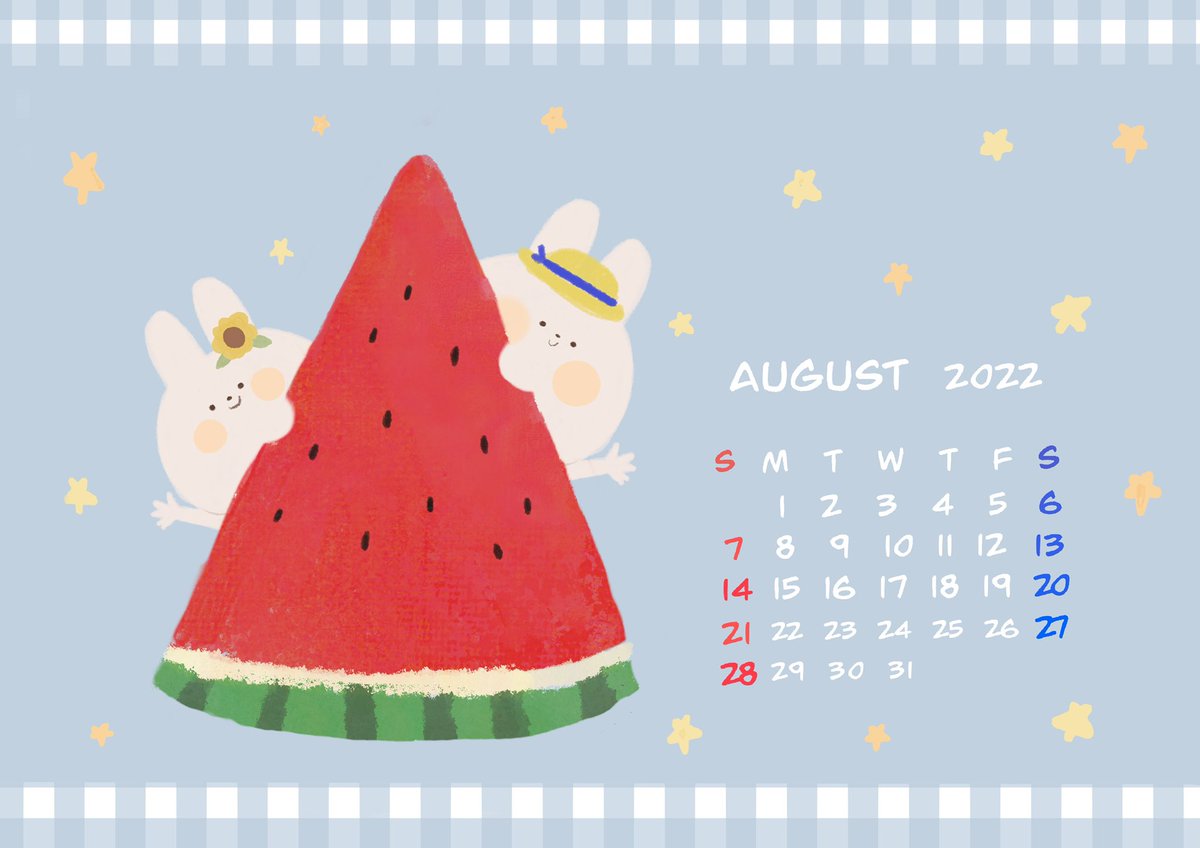 3 37 🍉8月カレンダー作りました🍉 無料配布させていただきます✨ ネットプリントも用意しました🎶 プリント番号: D6DX5G6C (セブンで印刷できます!) スイカうさちゃん達とこの暑い 夏を乗り越えましょう🥹🔥 #夏の創作クラスタフォロー祭り #カレンダー #イラスト #壁紙 22/07/31 20:14