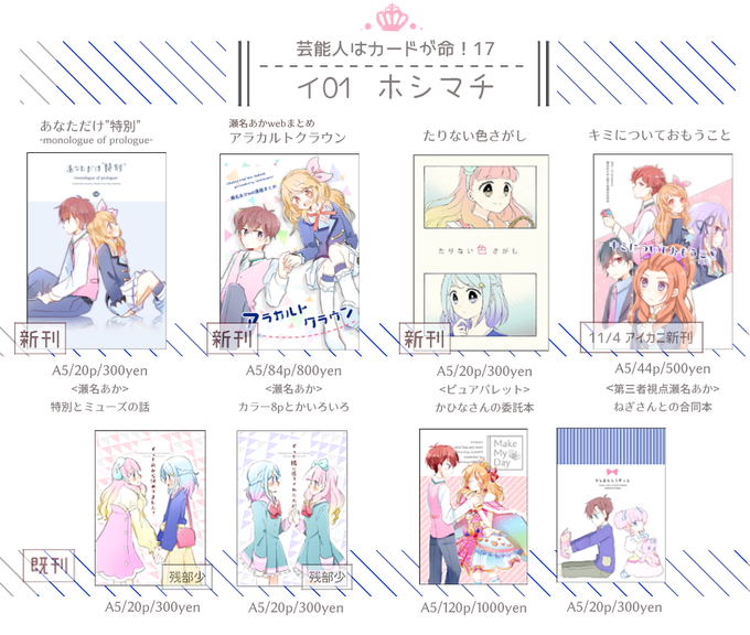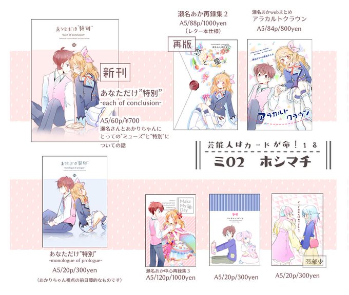 芸カ17のお品書きです! 新刊は瀬名あかとかピュアパレット委託本とか。ツリーで追々追記予定。 よろしくどうぞ〜!#芸カ17 #芸カ17お品書き