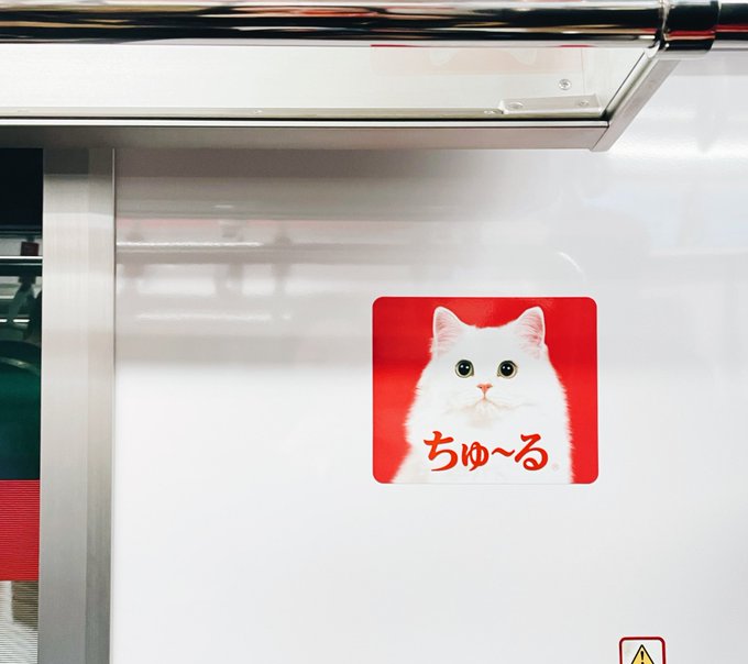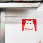 ちゅ〜る電車に乗れたのですが、ドア横ステッカーシンプルでとてもいい…すごく目立つ!かわいい! これだけで成立するちゅ〜るが育て上げたブランド力がまずすごいんだなあ