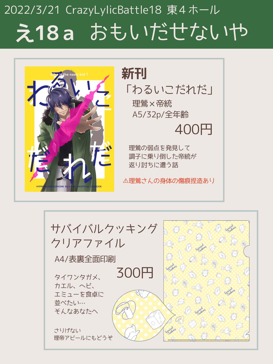 6 10 3/21のおしながきです! 新刊サンプルはツリーに繋げておきます🌲 クリアファイル、こうは書いていますが特に食卓に並べたくない方も遠慮なくお手に取ってください。 よろしくお願いします。 22/03/19 17:36