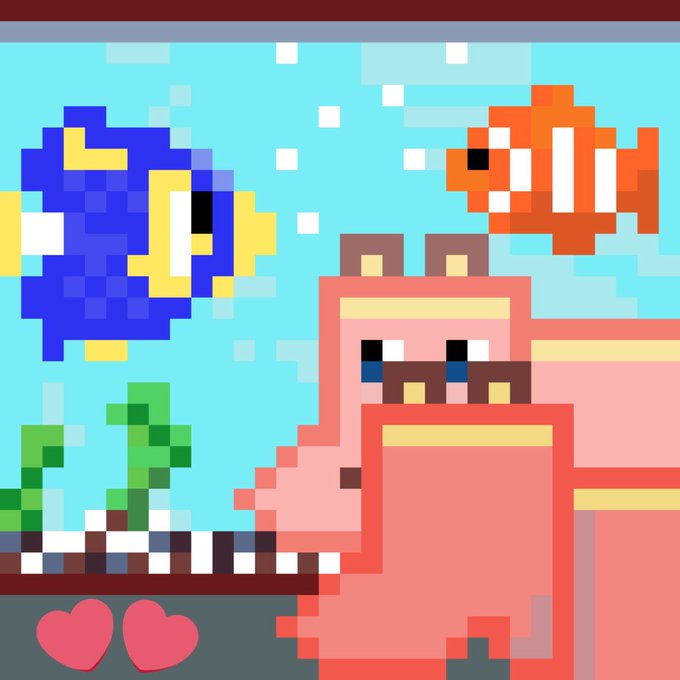 こんばんは✨ 今日の長靴犬(Rainboots dog)は水槽の中を見ているわんちゃんです✨ 虫が苦手な友達の推しを描いて見ました笑 熱帯魚確かに可愛い🥰 #NFT #ドット絵 opensea.io/collection/rai…