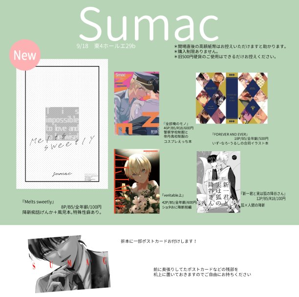 9/18東4エ29bに『Sumac』でスペースいただきました。 新刊は痴話喧嘩降新+風本 8p/100円/全年齢 ノベルティで間に合えばポスカ配布いたします。 会場直後は席を外しております。 よろしくお願いします🐰