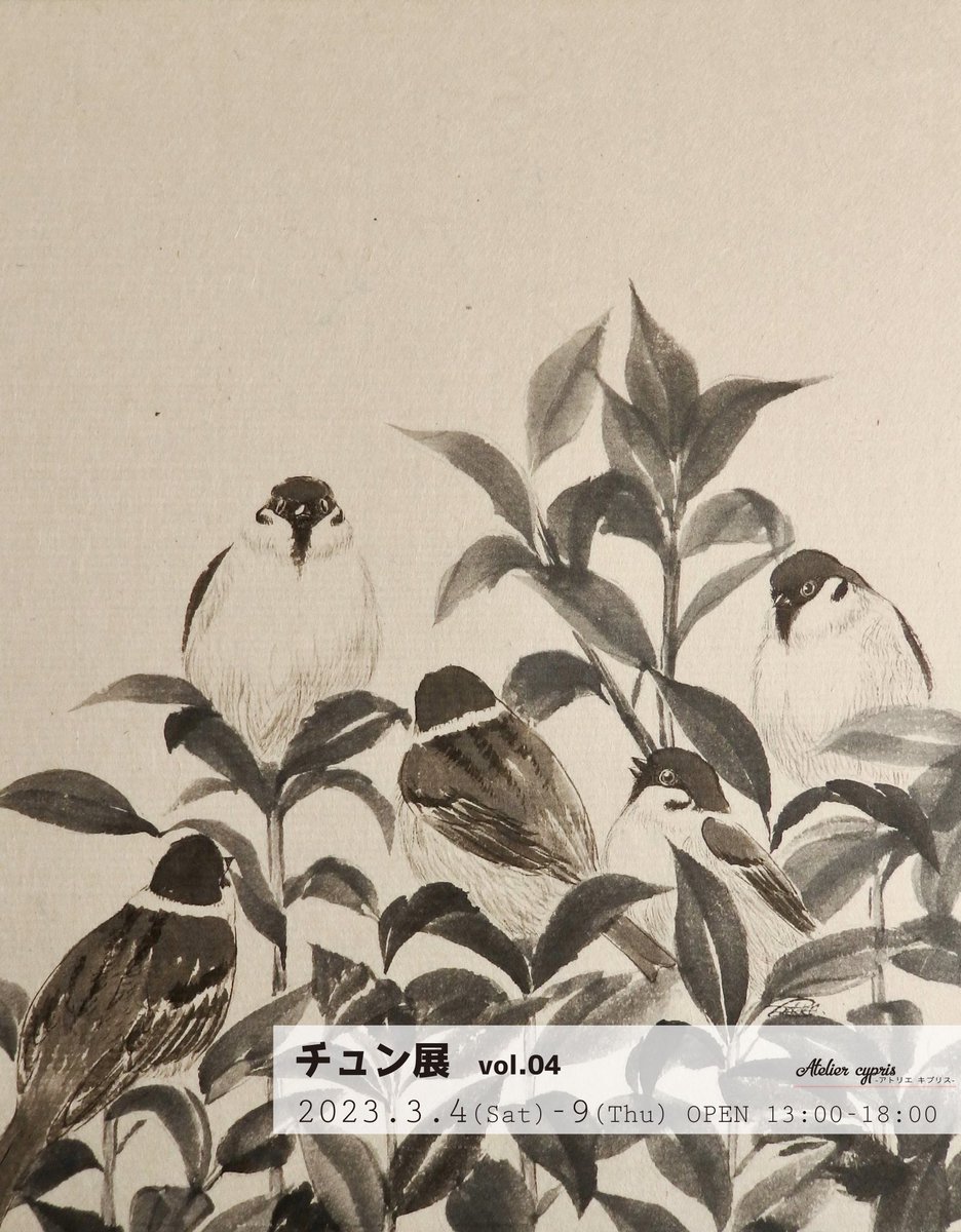 1 3 グリ目前ですが、こちらも出展します。今年は魔改造額縁に入れたすし詰めチュン。ぎゅうぎゅう詰めです。よろしくお願いします🐤 大阪緑橋 @Atelier_cypris 3月4日〜9日 #キプリス #チュン展 #野鳥 #水彩 #顔彩 #アナログ絵 twitter.com/Atelier_cypr… 23/02/16 20:13