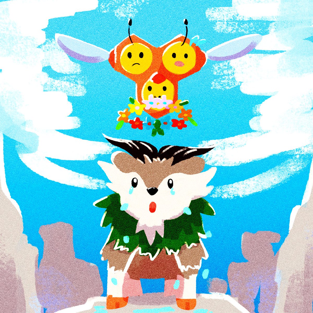 #ポケモン版深夜の真剣お絵描き60分一本勝負 #イラスト 迷子のメェークルとミツハニー 初めて参加したけど楽しかったです( ¨̮ )