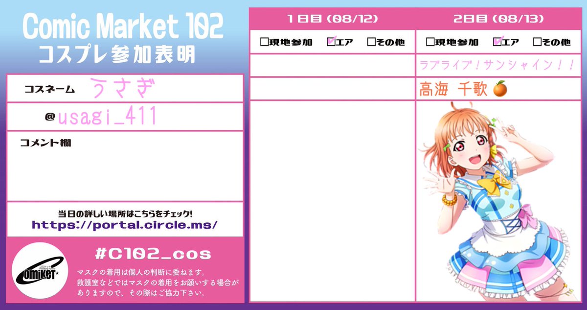 ♡予定♡ #うさぎにゅーす 🐰8/13 夏コミ!🍊 西 ″さ″20a #c102 🐰9/10 僕ラブ🍊 🐰9/30 #らぶふろ2 穂🧡 @ スタジオ・モンキー tiget.net/events/252557 🐰10/9 #らぶみらvol6💧 @ ジールシアター新宿 tiget.net/events/254490 🐰11/18 大阪遠征💧 #みゅーしゃわみらくる 🐰12/23💧