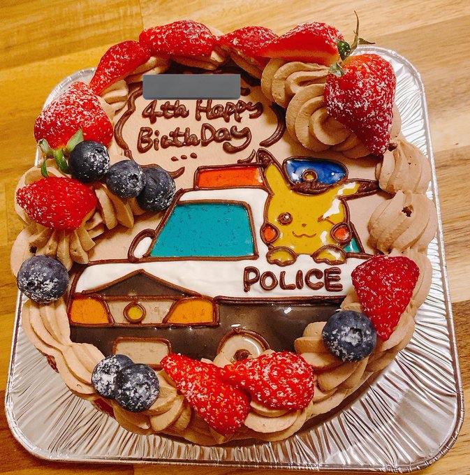 今日は息子の誕生日だったのですが、このケーキ可愛すぎませんか…!?😭 ピカチュウとパトカー描いてくださいとだけリクエストしたのですが、めちゃくちゃクオリティ高くてびっくりした…!